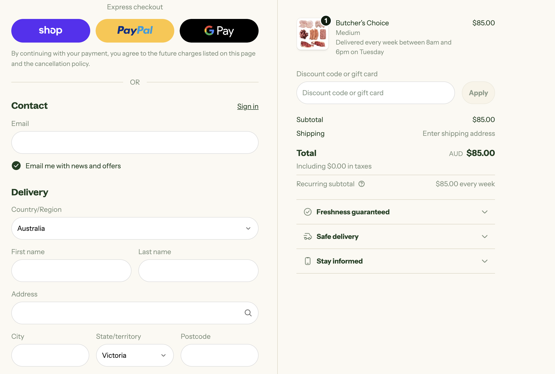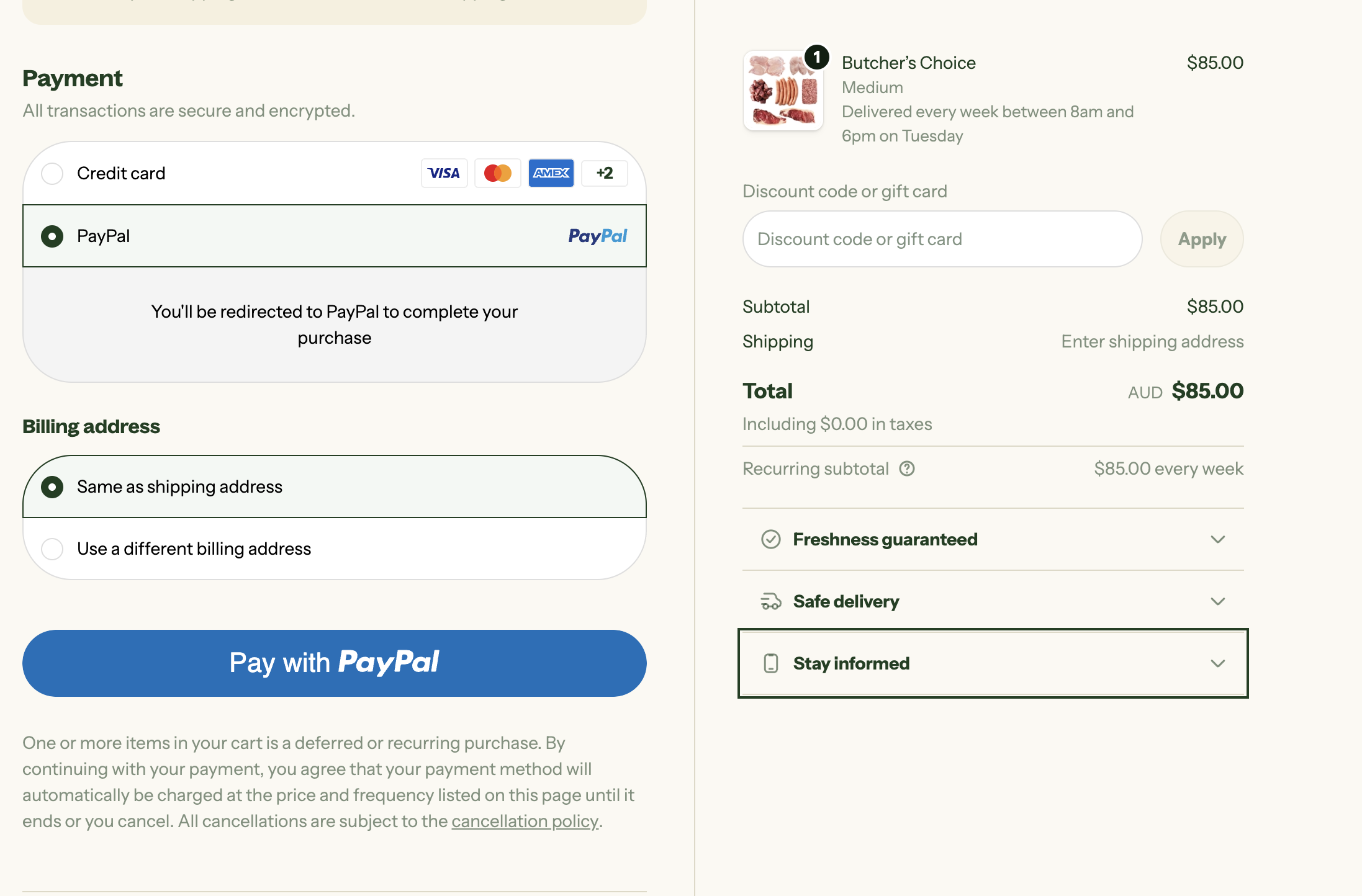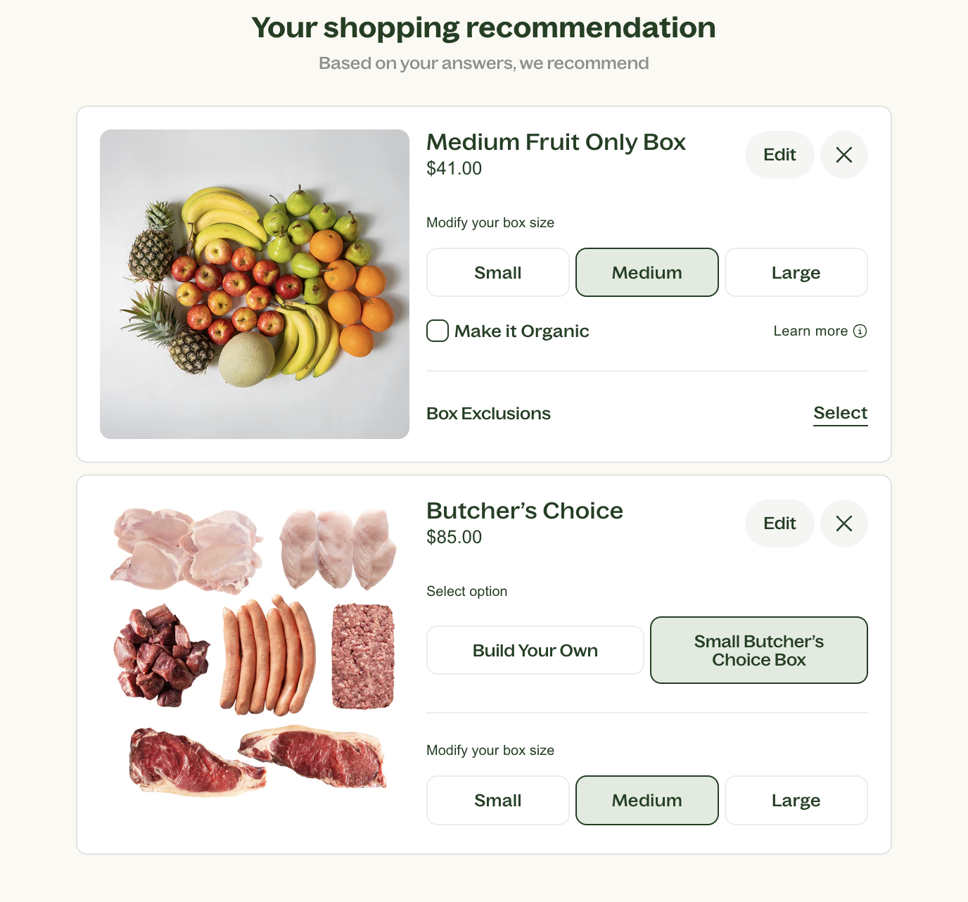 - Butcher's box (Small, medium, large, or create your own)